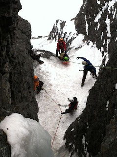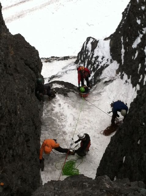 Day four of the Waterfall Ice Rescue Workshop featured a multi-pitch lower in the Skylight climbing area. Kevin took some photos of the operation from the top of the second pitch. Enjoy!